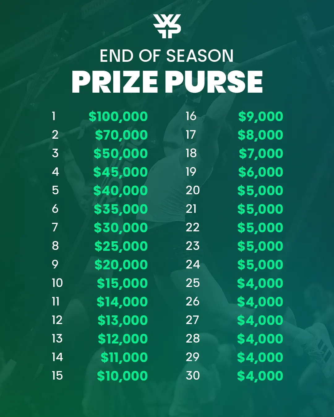 At the World Fitness Finals, a total of $1,138,000 will be allocated to the Pro divisions ($569,000 per division) paying out all 30 athletes who qualify to the Finals based on their season long point totals: